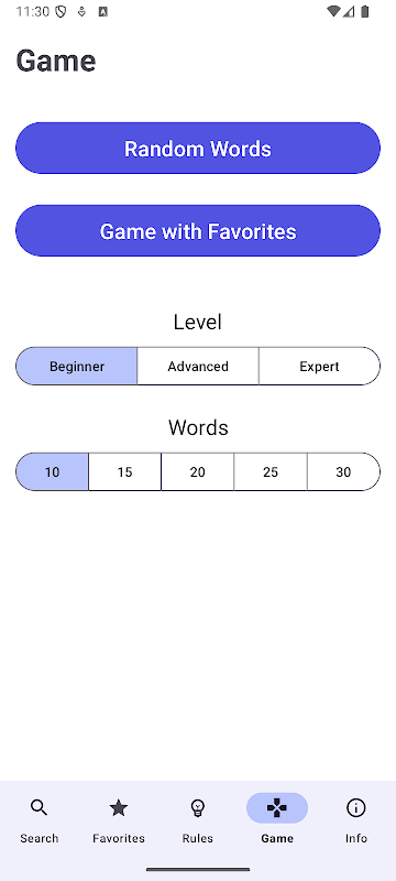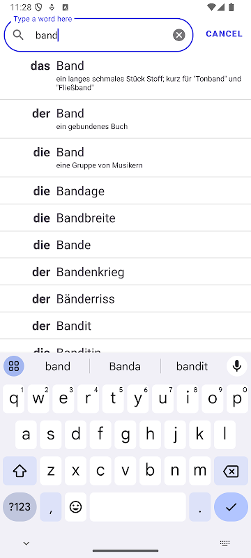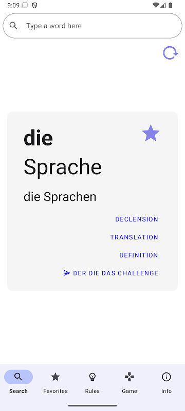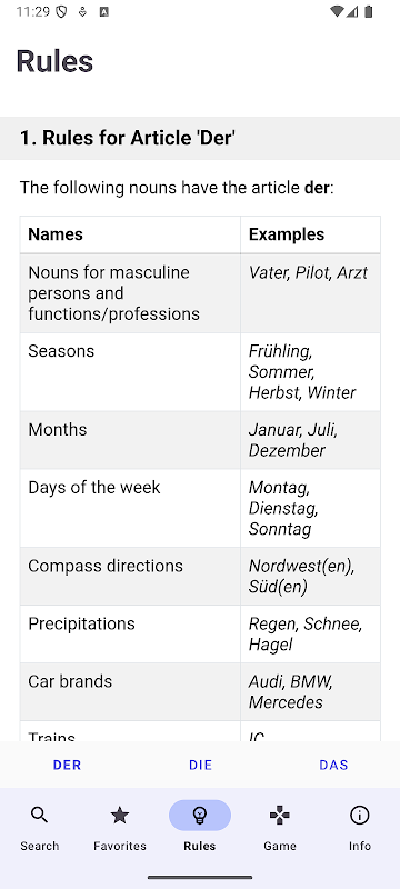 名詞の最初の数文字を入力すると、すぐに記事が表示されます。このアプリには、17,000 を超える名詞を含む辞書が含まれています。オプションで、名詞の翻訳または定義を表示できます。