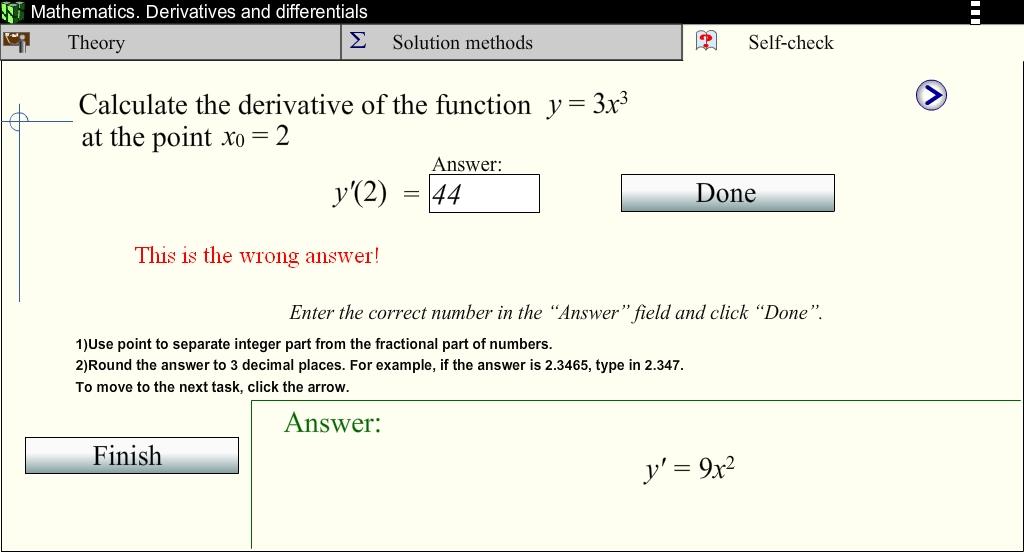 アプリケーションの主な目的は、主要な理論的なポイントと分化の技術だけでなく、溶液中で実践的なスキルとしてデリバティブと差の計算の中で最も一般的なタスクの開発に学生を支援することです。