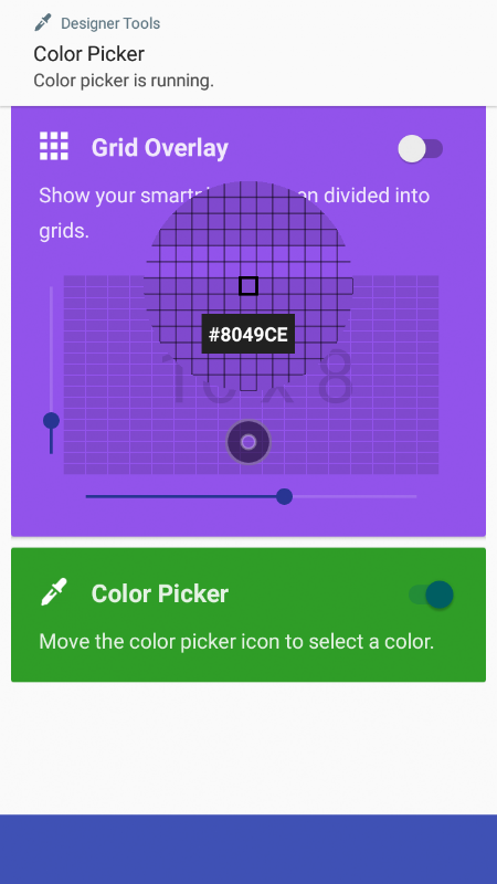 Designer tools provide a grid overlay and color picker on your smartphone screen.