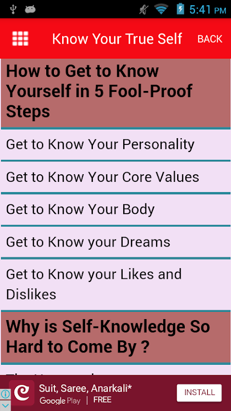 In this age of fashion and trends it is very important to know yourself as it helps you to stay on your feet. One should learn try to know their ownself during one’s free time as it helps them take the right decisions without being fazed by any difficult situation. In this know yourself app you will find topics that will help you in understanding the true meaning of being what you are and it also helps you appreciate and value yourself. With this know yourself app your thinking will become clear and you will appreciate the personality that you yourself are. With this know yourself app you will know what it is to not let go off your identity and stay yourself to take the right decisions. You can learn to know yourself and you will truly appreciate that.