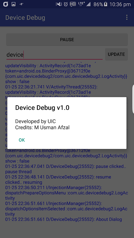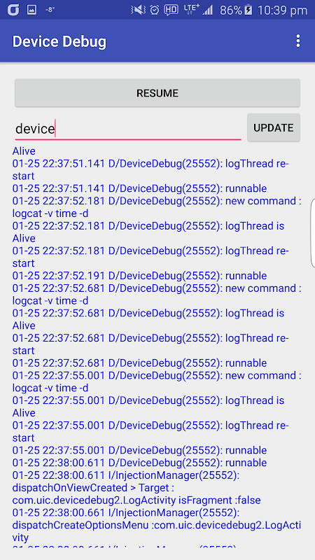 Device debug lets you debug application on your phone. No need to connect phone with PC to see the logs. You can just open device debug application, enter your application filter and you can monitor all logs by your application. It is helpful to monitor real time logs from application.