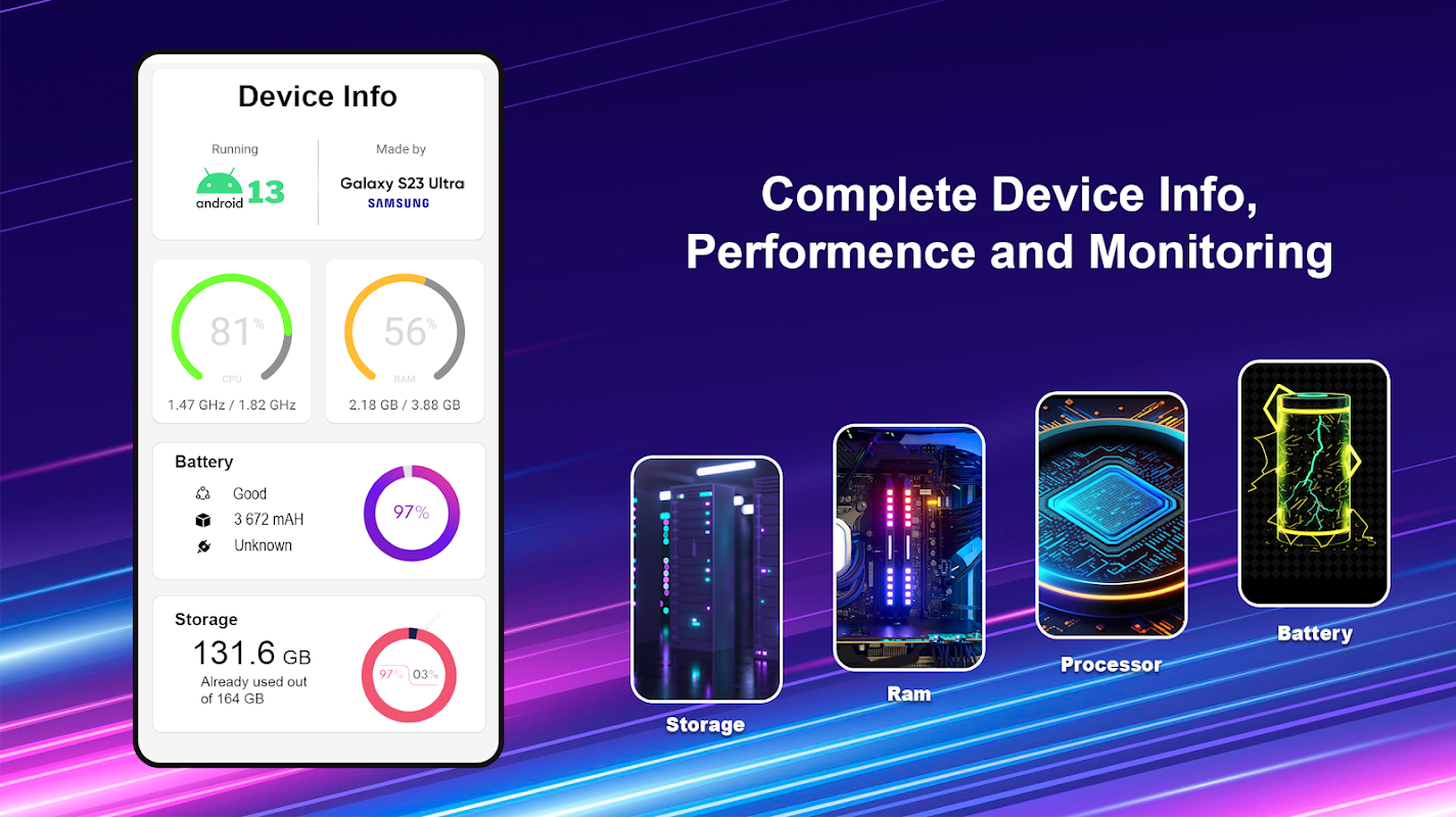 📊 ダッシュボード: RAM、内部ストレージ、外部ストレージ、バッテリー、CPU、利用可能なセンサー、インストールされているアプリなど、デバイスのソフトウェアおよびハードウェア情報の概要。