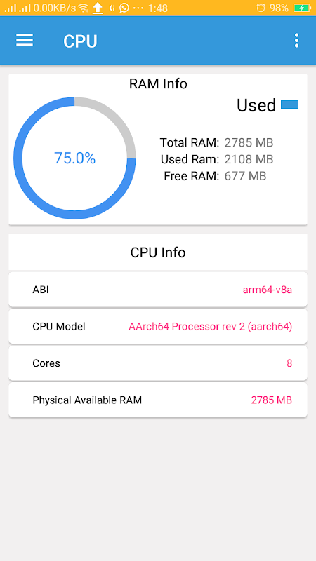 ● CPU ( RAM Used and Free CPU ABI, CPU model, Cores).