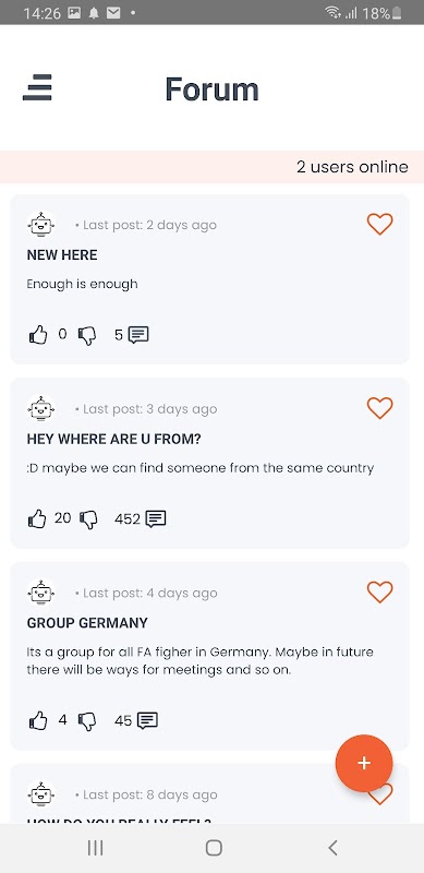 -摂食障害の話や食事を共有したり、他のユーザーに問題の解決を依頼したり、他のユーザーを助けて評判を得たりするための素晴らしいコミュニティフォーラムを自由に利用できます!