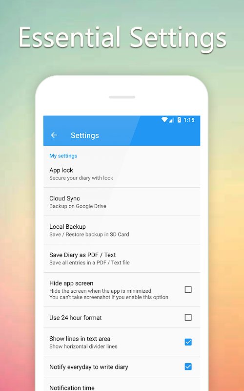 作り付けのロック設定であなたの日記を守ります。設定>アプリロックにgointでロックを設定し、ロックの種類を選択します。指紋オプションも有効/無効にできます。