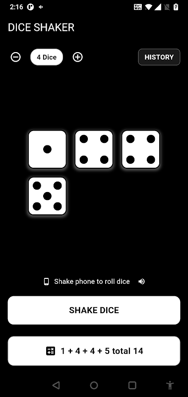 スマホを振ってサイコロを振ろう!履歴の追跡、1 ~ 6 のサイコロ、瞬時に合計とサウンドを表示