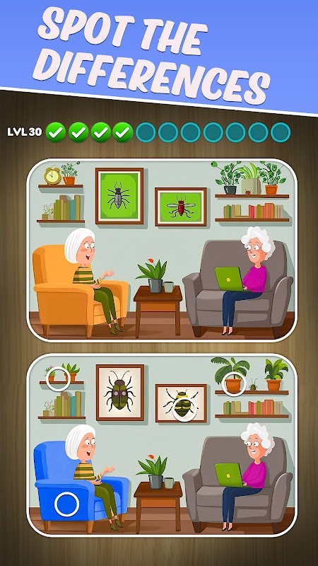 美しくデザインされたシーンで違いを見つけ、思考力を鍛えましょう。間違い探しゲームなら、チャレンジに飽きることはありません。間違い探しで、リラックスしながらも刺激的な体験をお楽しみください。一風変わったゲームをお探しの方にも、定番のパズルゲームをお探しの方にも、このゲームは最適です。