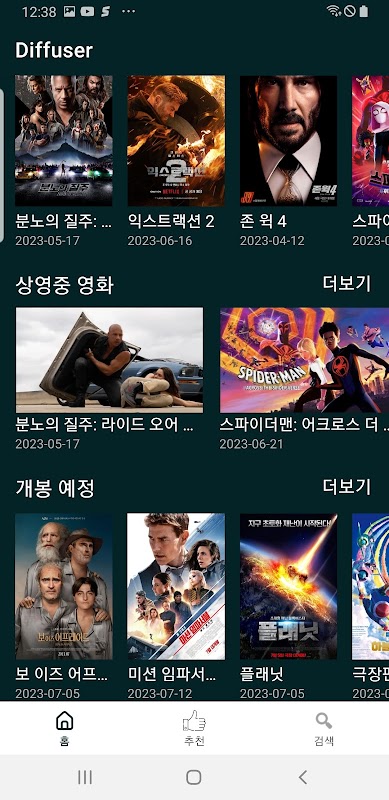 ホーム画面では、人気映画、上映中の映画、公開予定の映画を紹介し、さらに見る機能でより多くの映画を確認することができます。