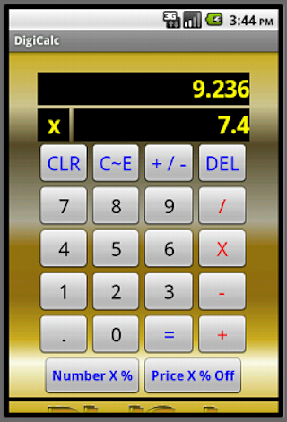 これは、加算、減算、乗算、除算を追加することができるシンプルな電卓です。それだけでなく、小数点以下の操作を行いません。あなたは、誤って入力した数字を削除することができます。あなたは、エラー行をクリアするか、単に表示をクリアしてやり直すことがあります。この計算機はオフボタン追加ショッピング割合を持っています。どの2進価格を返します。何かが定期的に39.99で販売されている場合たとえば、あなたは計算機で、その後X(回)ファンクションボタンを押していることを入力してください。その後、数として割合をオフに入力します - 例えば15(15%)。あなたは、ボタン「オフ価格のX%」を押して、それはあなたが実際に支払うことになる金額を返します!この場合33.99で、私の妻は、彼女が買い物に行くと(それは彼女のアイデアだった)割引カードやクーポンを持っている場合、それは滑らかであると考えています。