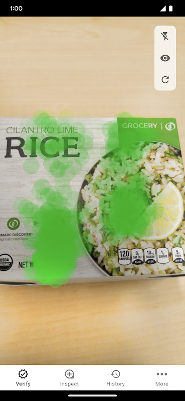 一致が成功すると、アプリは Signal Sight 機能を使用してパッケージまたは感熱ラベルの他の領域をスキャンし、追加のデータ検証を行うことができます。 Signal Sight は、Digimarc 電子透かしで強化された領域を照らします。パッケージまたはサーマルラベルのすべての拡張領域に、一致するデータを含む緑色のアニメーションが表示されます。