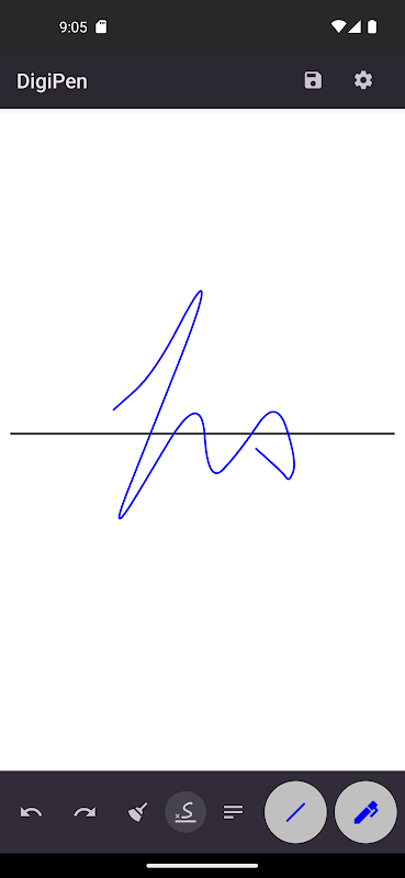 このアプリを使用すると、署名を作成し、白または透明な背景でデバイスに保存できます。使用可能な 4 つの色 (黒、青、赤、緑) の間で変更でき、5 つの異なる線サイズがあり、さらに、署名行とカスタムテキスト。