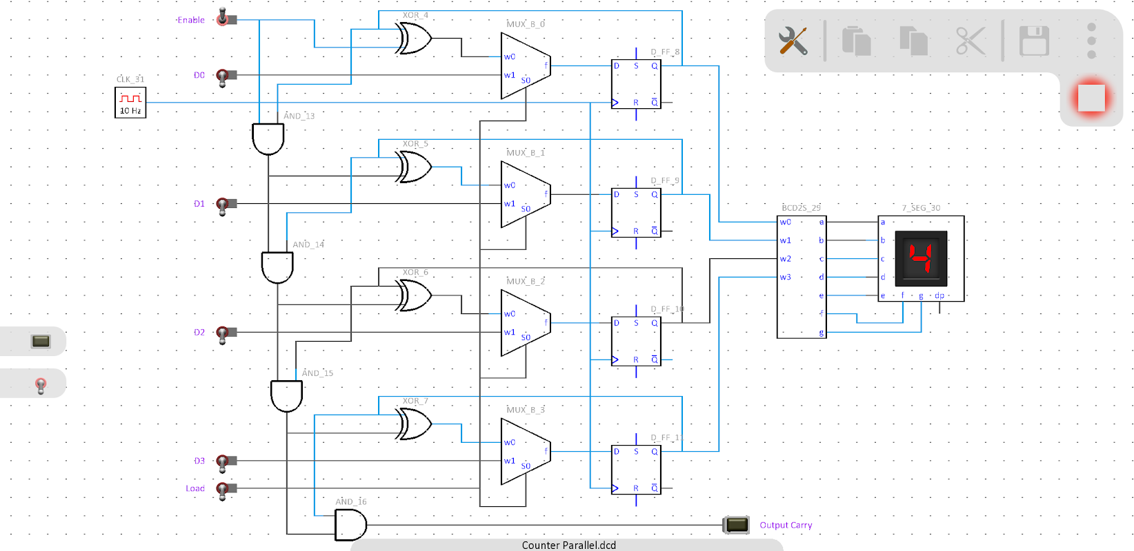 論理ゲート、カウンター、デコーダー、フリップフロップなどを使用してデジタル回路をシミュレートします