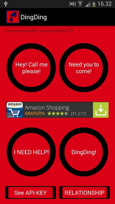 With DingDing you can sincronize your smartphone with another smartphone, and only with one click, you can send a message to your couple in a notification style, that warn him/her you need something! His/Her smartphone will vibrate and make sound (if the configuration allow this).
