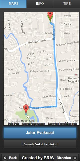 1. Menampilkan lokasi pengguna dan memberikan rute menuju lokasi evakuasi