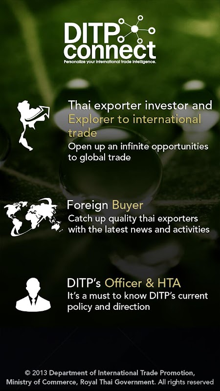 With the new Department of International Trade Promotion: DITP (Ministry of Commerce, Thailand) Mobile Application, "DITP Connect," it's the first Thai international trade application that allows "Personalized international trade information on your hand" and thus, it's hardly a surprise for anyone to miss key international trade intelligent information, trends and activities.