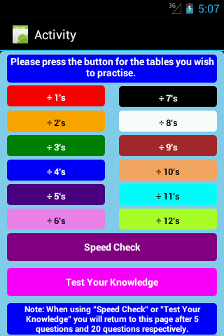 a] division tables – dividing the numbers: “1”; “2”; “3”, “4”; “5”; “6”; “7”; “8”; “9”; “10”; “11” and “12”. Each of the tables are accessible by menu; are revealed progressively; and will remain on the screen so the user can continue their study until they choose to return to the menu;