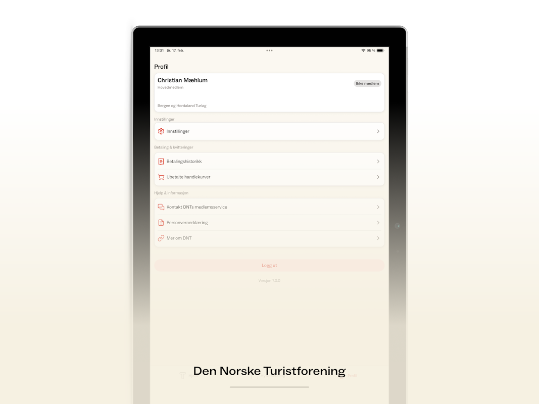 DNTアプリでは、DNT会員証(デジタル会員証)をご利用いただけます。さらに、多くのDNTセルフサービスキャビンおよび無人キャビンでは、キャビンの宿泊料金と食料品の買出し料金を簡単にお支払いいただけます。アプリは、携帯電話の電波が届くかどうかに関係なくご利用いただけます。