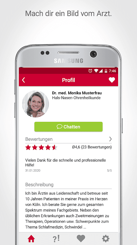 "An einem Samstagvormittag, an dem man sich eigentlich schon in einer übervollen Notdienstpraxis sitzen sieht, und man nachher mit einer Lapalie wieder nach Hause kommt, sehr beruhigend. Ich denke, so könnten einige im Endeffekt unnötige Besuche in der Notfallaufnahme verhindert werden und es bliebe wieder mehr Zeit für echte Notfälle. Weiter so!" (Chat mit Dr. med. Marion Eckert, Fachärztin für Kinder- und Jugendmedizin)
