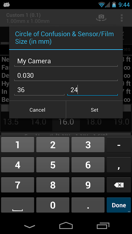 1. First 3 COC entries are customizable - select one and then press "Edit Camera" from the menu. Enter circle of confusion value and the dimensions of your sensor.