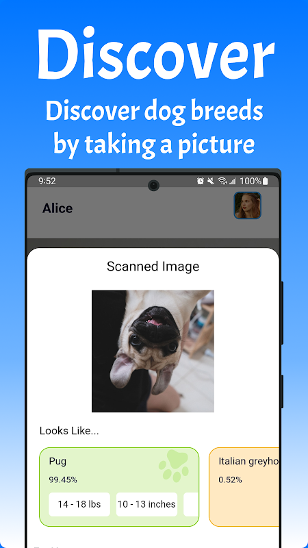 Dog App を使用すると、新しい犬種を即座に識別して発見できます。犬の写真を撮ると、当社の強力な AI テクノロジーがその犬種をすぐに認識し、その犬のユニークな特徴に関する多くの役立つ知識を提供します。