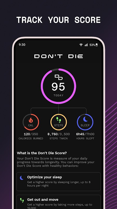 Don’t Die アプリは、Bryan Johnson と Blueprint のチームによって開発されたソーシャル ヘルス アプリです。 私たちの使命は、死とその原因と戦うことです。Don't Die アプリは、「Don't Die」ゲームを一緒に、または個別にプレイするためのプラットフォームを提供します。 このアプリの目標は次のとおりです。