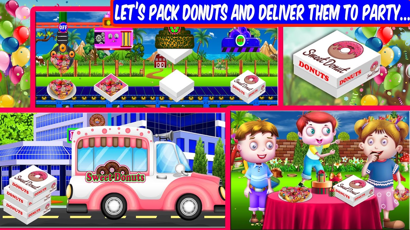 マシンシミュレータの助けを借りてドーナツを箱やロゴに詰める時が来ました。ドーナツは配送準備が整いました。配達少年のように行動し、配達トラックシミュレーターを通じてドーナツボックスを配達する。小さなドーナツ愛好家が配達を待っています。顧客に時間通りにドーナツを届けて、デザートパーティーを始めることができます。