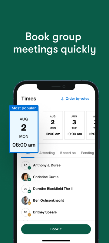 すべての往復とノーショーに別れを告げます。 Doodleアプリを使用すると、予定やチーム会議の時間を送信したり、空き状況を共有したりすることができます。誰が応答または時間を予約したかを確認し、予約後にイベントの詳細を自動的に送信してもらいます。 Doodleを使用すると、面倒なことなくスケジュールを設定できます。