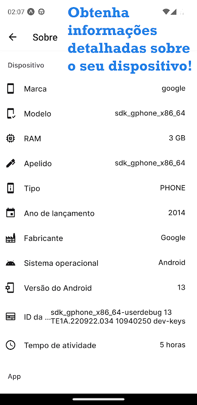 RAM、稼働時間、モデルなど、デバイスに関する完全な情報を表示します。