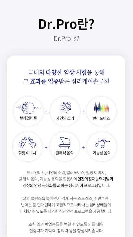 ブレインビート、ナチュラルヒーリングイメージ、クラシック音楽、自然の音、催眠、瞑想などを適用し、人間の潜在能力開発とイメージの安定を最大化することを目的とした新概念心理訓練プログラムです。