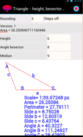 The application is designed to draw some geometric figures and calculate their characteristics. It can be drawn in scale such as: triangles, quadrilaterals, regular polygons, ellipses, volume figures such as straight, intersected or inclined cones, cylinders, pyramids, spheres. Their characteristics such as area, perimeter, volume, angles are calculated in real units of measurement. The app has a feature to draw some shapes in steps. The application may be useful in designing the mentioned figures or in the training process for working with geometric shapes.