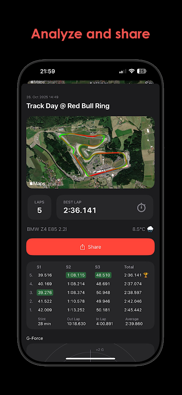 自動ラップ検出とセクタータイミングを備えた正確なラップタイマー、他のドライバーとのベンチマーク、加速、Gフォース、最高速度、潜在的なセクターゲイン、GPSベースのラップトラッキングなどの詳細なスティント分析機能を備えています。