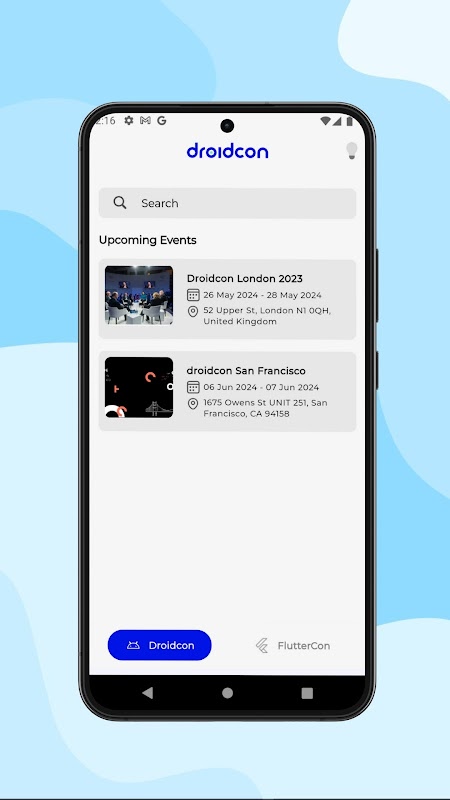 イベント選択:世界中で開催される様々なDroidconイベントから、イベント情報を閲覧して選択できます。