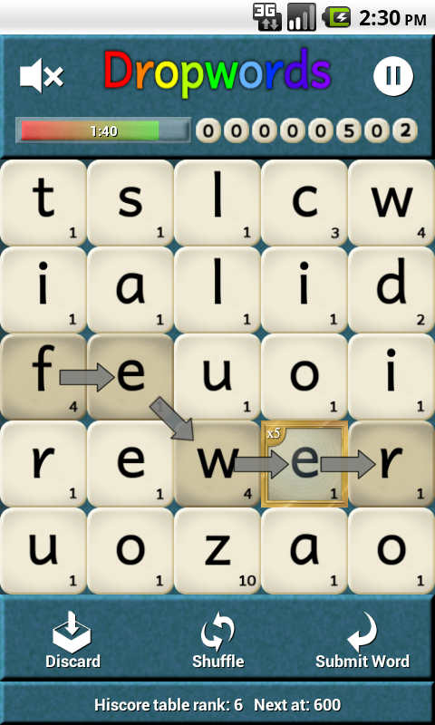 Dropwords is word-finding puzzle that combines some elements of Scrabble and Boggle. Valid words boost your score and the dwindling timer; used letters disappear and new ones drop from above.