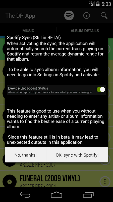 •Spotifyの同期:自動的にあなたのAndroidデバイス上でSpotifyの上で再生中のアルバムを検索します。また、この機能は、アルバムの平均ダイナミックレンジに新しいトラックが再生されるたびに表示されます。
