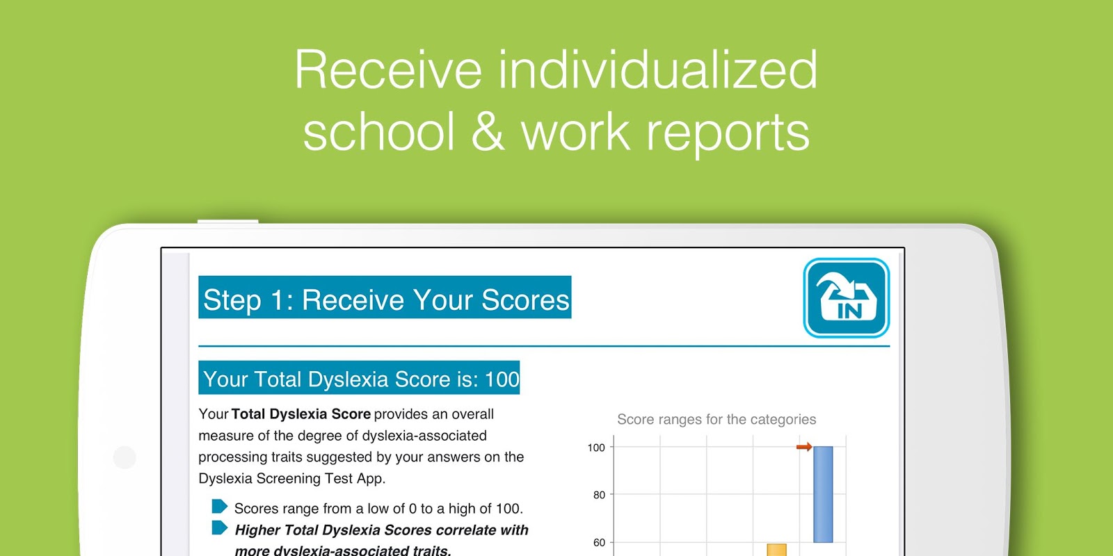 Neurolearning ディスレクシア スクリーニング テスト アプリは、読解力とスペル スキルの基礎となるいくつかの重要な脳機能を測定します。これらの測定値と現在の読解力の評価を組み合わせて、テスト ユーザーが学校や仕事で失読症に関連する課題を経験している可能性を判断します。スクリーニング後、ユーザーには結果の詳細で個別のレポートが提供されます。