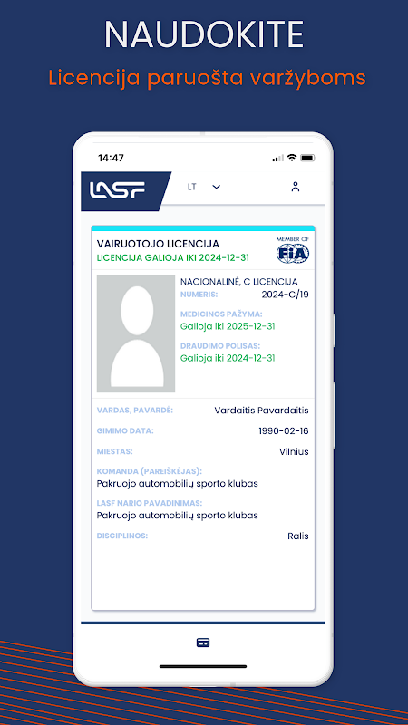 E-LASF アプリをダウンロードして接続すると、リトアニア モーター スポーツ連盟のライセンスをより便利に使用できます。 LASF ライセンスの物理カードをもう忘れることはありません。すべての LASF ライセンスは携帯電話に保存され、すぐに競技に参加できます。