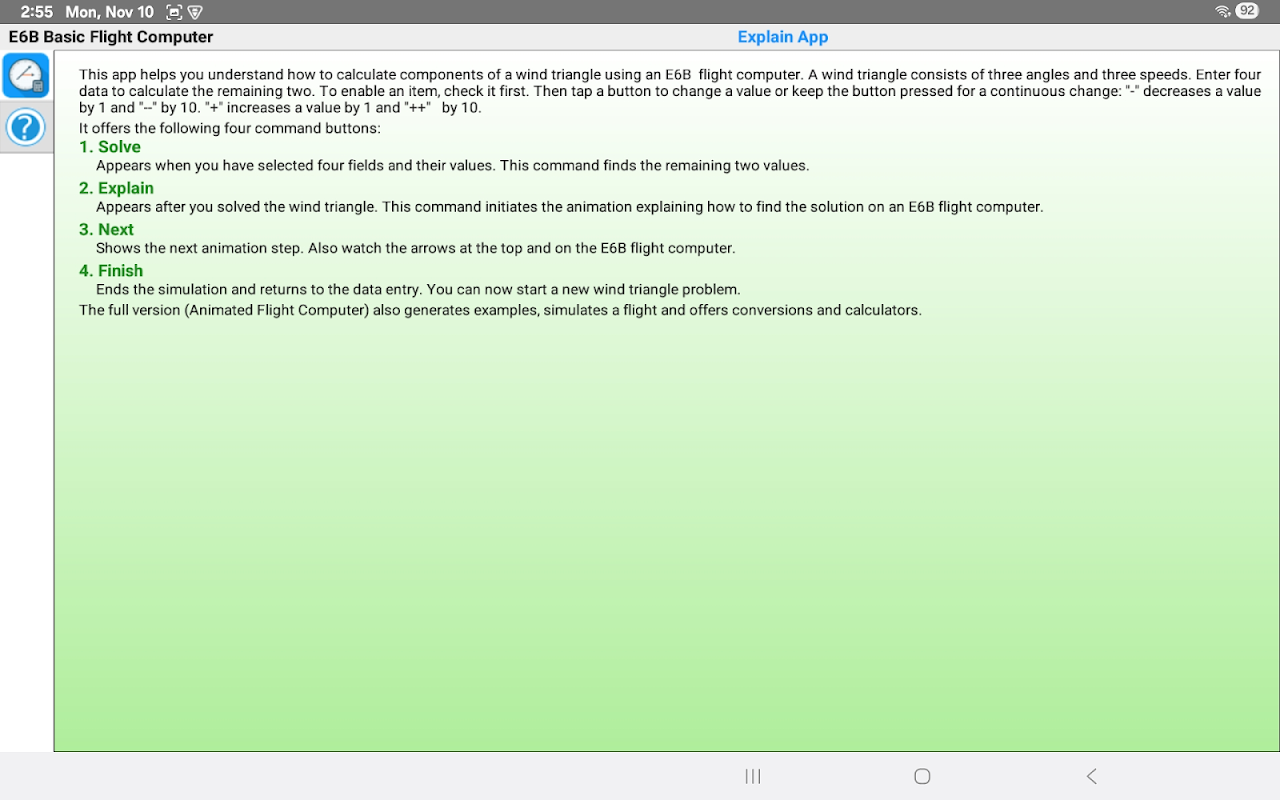このアプリは、6つの値(速度3つと角度3つ)のうち4つを入力し、残りの2つを計算することで、風向三角形を解きます。その後、フライトコンピュータを使ってこれらの結果を得る方法をアニメーションで説明します。ディスクを回転させ、スライドさせ、マークを追加します。また、解を求める各ステップで使用する値も示します。