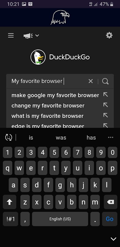 Eagle Browser は、最も安全な検索エンジン「DuckDuckGo」を使用して、より高速にブラウジングするのに役立ちます。ずっと