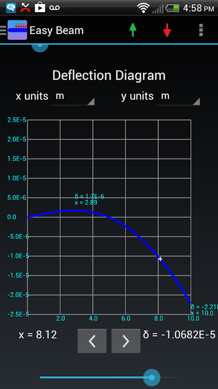 Interactive graphs allow the user to pinpoint shear and moment anywhere on the beam or determine where the max deflection will occur in their beam analysis. That's because Easy Beam's graph allow the user to use a seek bar to move a cursor along the graphs. By default, the graphs also display local min and max values on the screen for your convenience.