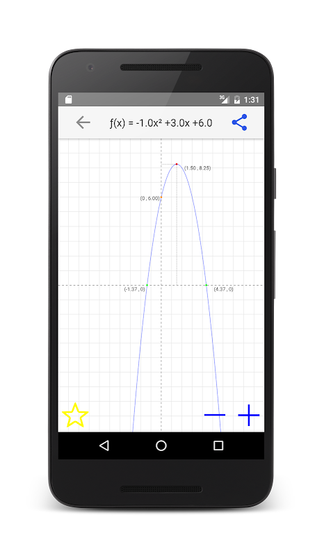 グラフ作成機能に加えて、このアプリは、同様に頂点計算機として機能します。あなたが分析し、各放物線または一次方程式については、X切片と機能のY切片は、明らかにそれが簡単に、ユーザーが瞬時に任意の方程式の頂点を取得できるようにすること、グラフ上にマークされています。