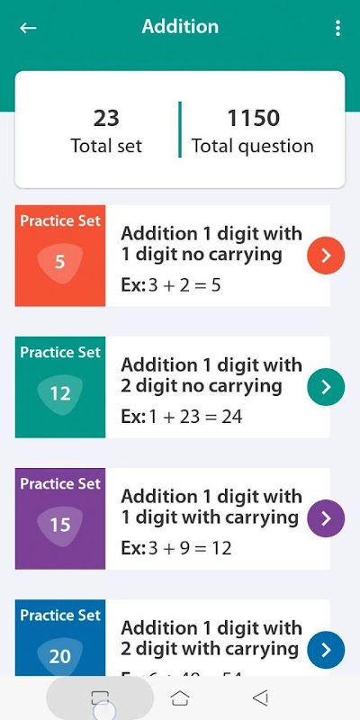 Each category has different play modes to improve math skills - Play, Learn, Quiz, Practice, Duel and Test. Math games can be Educational Learning for kids or brain training app for Adults. Basic and simple Math Game of addition, subtraction, multiplication and division with colorful worksheets. Each set of worksheet shows a score after completion.
