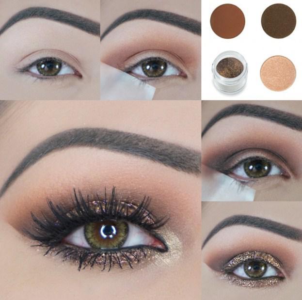 目には、暖色系の濃い茶色のアイペンシルから始めましょう。まつ毛を混ぜ、アイシャドウブラシで拭きます。