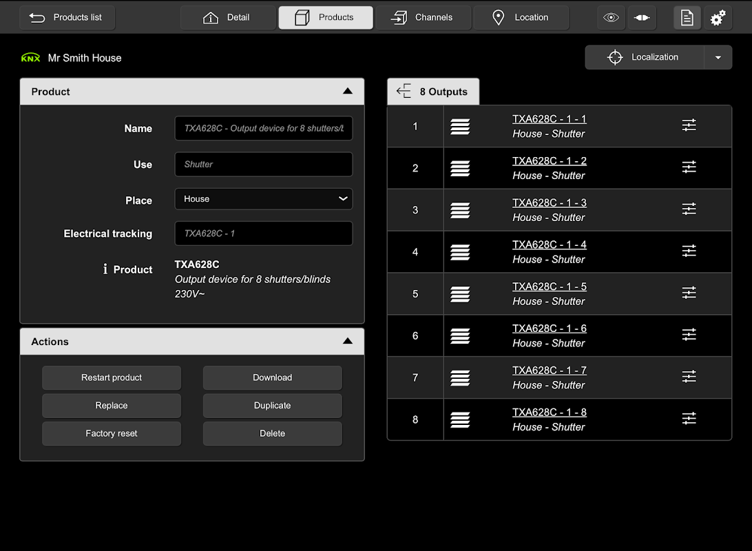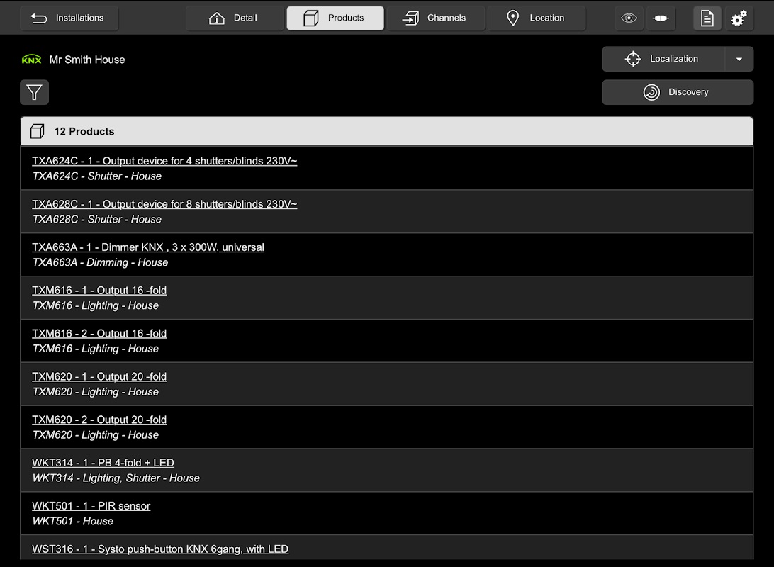 たとえば、各チャネルをインスタレーションに配置できます。MMIでチャネルを選択すると、物理チャネルがアクティブになります(ランプの切り替え、シャッターの移動など)。