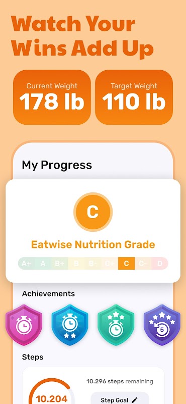 進捗チャート – 体重、習慣、そして目標達成までの道のりを視覚的に記録します。カロリー推定ツール、カロリーカウンター、食事トラッカーからの更新情報はすべて、あなたの目標達成を計測可能にし、モチベーションを高めます。