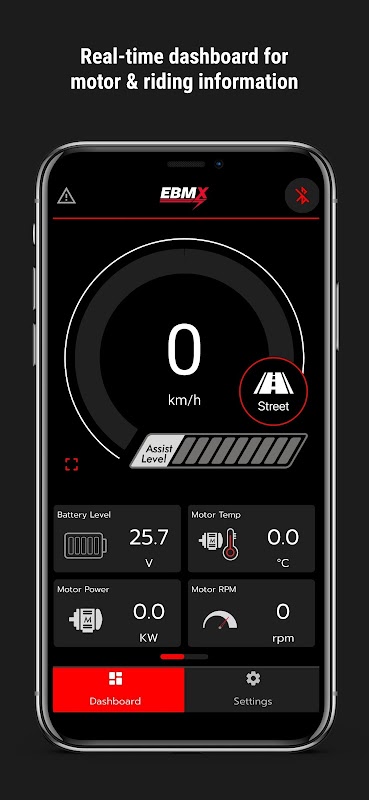 EBMX X-9000 アプリには 2 つの主な目的があります。まず、速度、出力レベル、消費電力、温度、RPM、走行距離計などのリアルタイムの自転車統計を表示する情報ダッシュボードとして機能します。