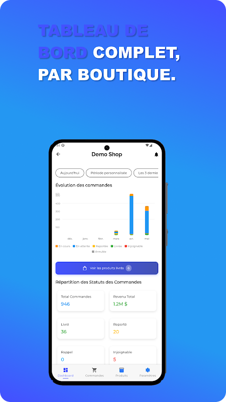 ECAMS には、国、店舗、商品、クローザー、配送ドライバーごとの統計情報を表示する包括的なダッシュボードも含まれています。配送済み、拒否済み、延期済み、キャンセル済みの注文数を正確に把握できます。パフォーマンスを比較し、戦略を調整し、成約率を最適化することができます。