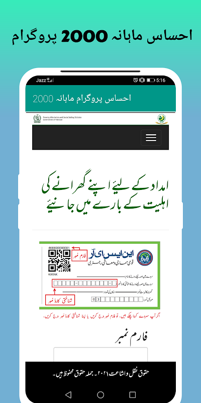 The purpose of Ehsaas Mahana 2000 program app is to provide information only which is freely available on internet. The source of information is https://www.pass.gov.pk/
