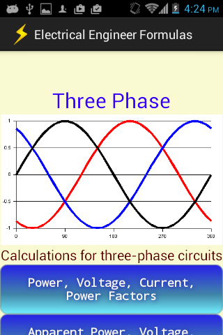 Electrical Engineering Formulas helps with complex calculations of single phase, three phase and direct current.