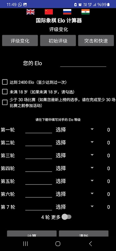 ELO レーティング計算アプリへようこそ。このアプリは、さまざまなゲーム形式にわたって ELO レーティングを追跡および管理するための究極のツールです。あなたがチェス、e スポーツ、または ELO レーティングを利用するゲームの競技プレイヤーであっても、このアプリを使用すると、レーティングを計算し、パフォーマンスを理解するプロセスが簡素化されます。