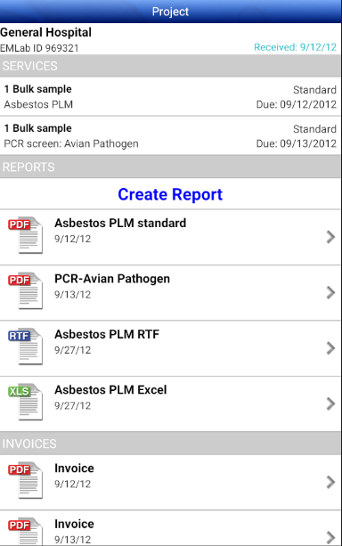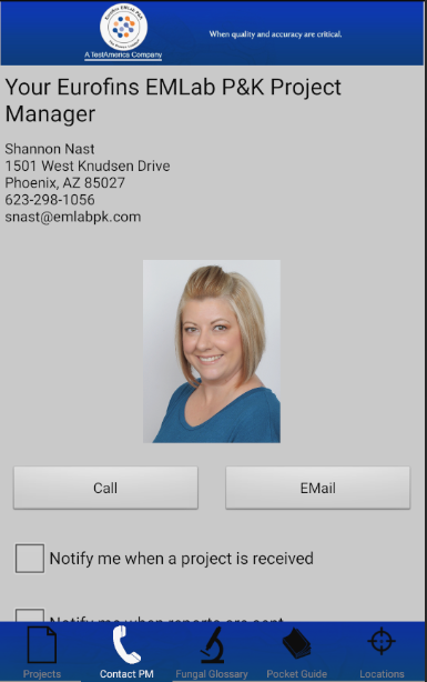Eurofins EMLab P&Kアプリは、いつでもどこでもラボの結果にモバイルアクセスできるため、作業が簡単になります。これで、プロジェクト、レポート、請求書を確認し、Eurofins EMLab P&Kの真菌ライブラリとIAQポケットガイドを参照し、画面をタップしてプロジェクトマネージャーに連絡できます。